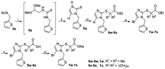 The synthetic route to target compounds 1w–1x is presented in Scheme 5. Imidazole thione 5q was prepared from isothiocyanate 3h following the procedure described above for the synthesis of 5o from 3l. Treatment of thione 5q with ethyl 2-bromo-2-methylpropionate and ethyl 1-bromocyclobutanecarboxylate in the presence of K2CO3 in DMF at elevated temperatures (60 °C for 6w and 40 °C for 6x) produced 6w and 6x, respectively. Compounds 6w–6x were converted to target compounds 1w–1x following the procedure used for the synthesis of 1q–1s from 6q–6s shown in Scheme 3 except that the bromination of 6w–6x with NBS was carried out at 0 °C in order to suppress the potential bromination of thiophene ring.