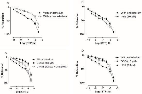 Vasorelaxant response of STP (0.01 nM–100 µM) in pre-contracted (Phe; 10 µM) superior mesenteric rings with (●, n = 11) or without endothelium (ο, n = 9) (A); In the presence of Indo (10 µM; ▲, n = 6) (B); In the presence of L-NAME (100 µM; ■, n = 9) (C); In presence of L-NAME (100 µM) plus L-arg (1 mM) (□, n = 6) (D); In the presence of HDX (30 µM; ▲, n = 8) or ODQ (10 µM; ♦, n = 8). The data are presented as the means ± SEM.