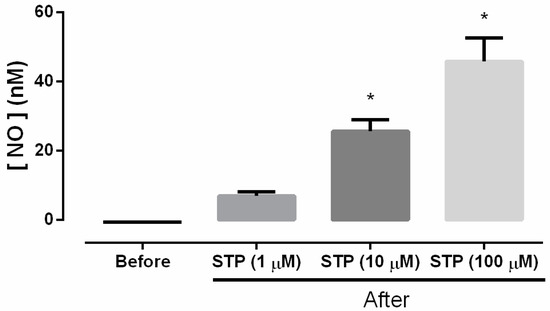 Representative bar graph of [NO] nM before and after the addition of STP (1, 10, and 100 µM) to selected samples of ECs; Data were normalized to the SNAP standard curve. The data are presented as the means ± SEM. Differences were analyzed by ANOVA One Way followed Bonferroni post-test. * P < 0.05 vs. Before