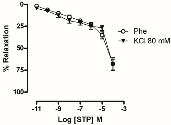 The relaxation mechanism of STP was also evaluated using 80 mM KCl as contractile agent; in this case, the modified Tyrode’s solution (from 4 to 80 mM of KCl) was prepared by replacing Na+ with an equimolar concentration of K+ to maintain a constant ion strength in the bath solution [43].