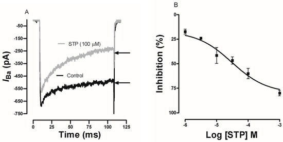 Ca2+ currents through voltage-gated Ca2+ channels were evoked in GH3 cells by a depolarizing pulse to 0 mV (100 ms of duration) from a holding potential of −80 mV. Figure 5A shows the representative current traces obtained in the absence (Control) and in the presence of STP (100 µM). The STP (100 µM) perfusion reduced the inward Ca2+ current measured at the end of the pulse more than the current measured at the peak. Figure 5B shows the concentration-dependent relationship between the Ca2+ current at the end of the pulse and the drug concentration (1 µM–1 mM). The estimated pD2 was 4.53 ± 0.15. At the higher tested concentrations, STP inhibited approximately 80% of the Ca2+ currents, suggesting a possible effect on the voltage-gated Ca2+ channels.