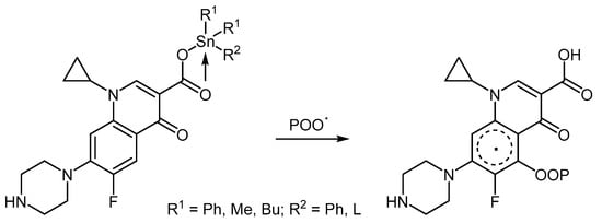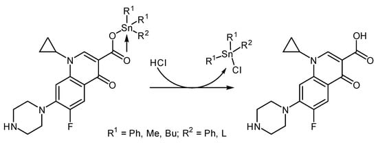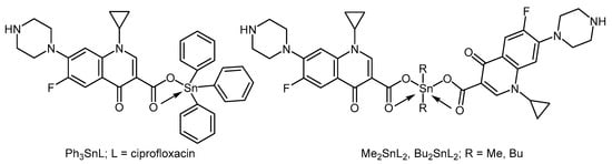 - Ghazi, D.; Yousif, E. Design of organotin (IV) complexes derived from ciprofloxacin. Int. J. Res. Eng. Innov. 2017, 1, 63–65. [Google Scholar]