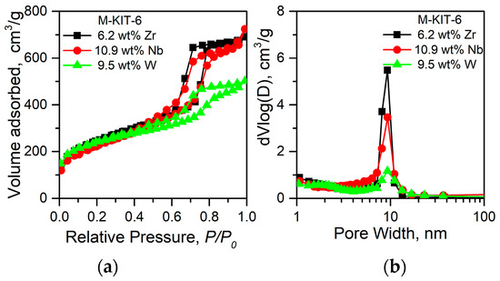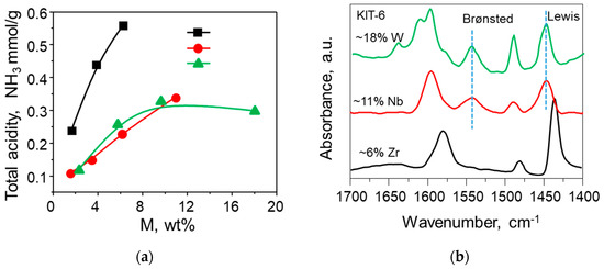 Figure 4b compares the Lewis and Brønsted acidities of the M-KIT-6 materials. The Zr-KIT-6 materials are predominantly Lewis acidic at all metal loadings up to 6 wt % [27]. Nb-KIT-6 materials exhibit Lewis acidity of much lower strength compared to Zr-KIT-6 [26,29]. However, a pronounced increase in Brønsted acid sites is observed at higher Nb loadings. Even though the total acidity of W-KIT-6 materials is similar to Nb-KIT-6 materials, the number of Brønsted acid sites is higher compared to Nb-KIT-6 (Figure 4b). In the following sections, we discuss how the tunable acidities of metal-incorporated KIT-6 materials may be exploited in a variety of industrially relevant chemistries.