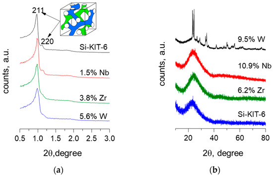 (a) Representative SAXS patterns, and (b) XRD diffractograms of M-KIT-6, at various metal loadings compared with pristine Si-KIT-6.