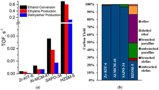 As shown in Figure 5a, catalysts possessing a higher fraction of strong Brønsted acid sites, such as H-ZSM-5 and SAPO-34, displayed much greater ethanol dehydration activity at similar operating conditions compared to mesoporous materials, such as Al-MCM-41 and Zr-KIT-6 [31]. However, as shown in Figure 5b, H-ZSM-5 yielded several side products (branched and unbranched paraffins, branched olefins, aromatics, etc.) in significant quantities, in addition to ethylene and diethyl ether, while zeolites H-MOR [34] and H-BEA [35], with similar strong Brønsted acid sites are more selective for ethylene [36]. The enhanced formation of ethylene and diethyl ether in zeolites is generally attributed to the presence of very strong Brønsted acid sites, as well as the confinement effect [36]. The generation of stronger acid sites by metal incorporation benefits ethylene selectivity by not only increasing the reaction rates over the acid sites, but also poisoning the basic sites that are responsible for the formation of dehydrogenation products [37].