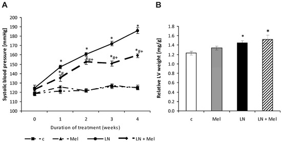 The influence of melatonin (LN + Mel) on blood pressure (A) and relative left ventricular weight (LVW/BW); (B) in l-NAME-treated rats. Wistar controls (c); l-NAME (LN); melatonin (Mel); n = 10 per group; * p < 0.05 vs. c; # p < 0.05 vs. LN; + p < 0.05 vs. Mel.