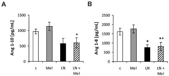 The influence of melatonin (LN + Mel) on the serum level of angiotensin 1–10 (Ang I) (A); angiotensin 1–8 (Ang II) (B). Wistar controls (c); l-NAME (LN); melatonin (Mel); n = 6 per group; * p < 0.05 vs. c; + p < 0.05 vs. Mel.