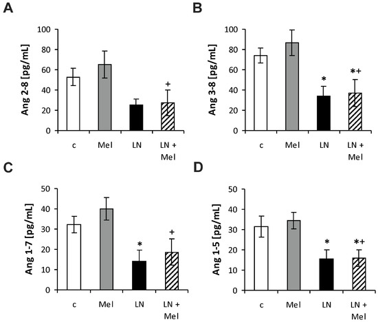 The influence of melatonin (LN + Mel) on the serum level of angiotensin 2–8 (Ang 2–8) (A); angiotensin 3–8 (Ang 3–8) (B); angiotensin 1–7 (Ang 1–7) (C); angiotensin 1–5 (Ang 1–5) (D). Wistar controls (c); l-NAME (LN); melatonin (Mel); n = 6 per group; * p < 0.05 vs. c; + p < 0.05 vs. Mel.