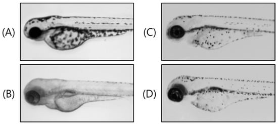 - Chio, T.Y.; Kim, J.H.; Ko, D.H.; Kim, C.H.; Hwang, J.S.; Ahn, S.; Kim, S.Y.; Kim, C.D.; Lee, J.H.; Yoo, T.J. Zebrafish ax a new model for phenotype-based screening of melanogenic regulatory compounds. Pigment Cell Res. 2007, 20, 120–127. [Google Scholar] [CrossRef] [PubMed]
