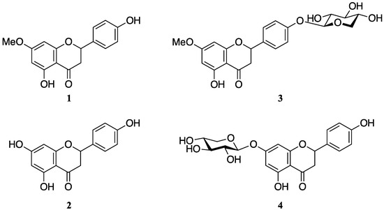 Structures of sakuranetin (1), naringenin (2), sakuranetin-4′-O-β-d-xylopyranoside (3), and naringenin-7-O-β-d-xylopyranoside (4).