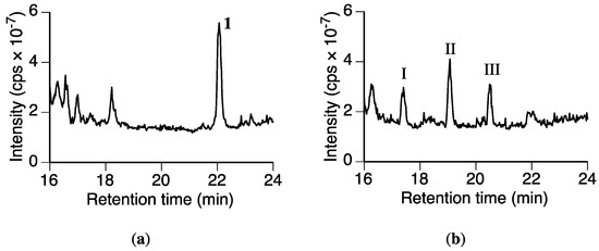 Total ion current chromatograms obtained from the Rhizoctonia solani suspension cultures containing sakuranetin (1) using LC-MS. (a) Chromatogram after 0 h of incubation following the addition of 1; (b) 12 h of incubation after the addition of 1.