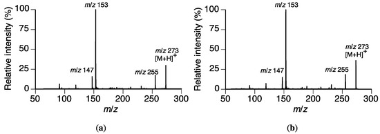 The mass spectrum of peak II showed a plausible [M + H]+ ion at m/z 273, which was consistent with the [M + H]+ of naringenin (2). The tR of II (19.1 min) coincided that of 2, which had been identified as a metabolite of 1 by P. oryzae in our previous study [10]. The tR and collision-induced dissociation-mass spectrum (CID-MS) of peak II were compared with those of 2 in LC-MS/MS analysis. The tR and CID-MS were consistent as shown in Figure 4. Therefore, we concluded that peak II was from 2.