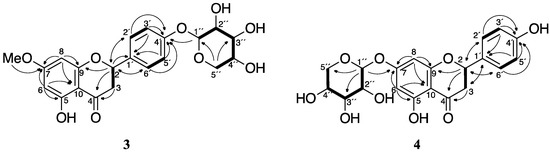 Key 2D NMR correlations for compounds 3 and 4. The COSY and TOCSY correlations are represented by bold lines, and the HMBC are represented by arrows from H to C.