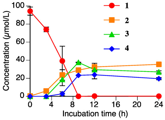 Figure 6 shows the time-dependent accumulation of 2, 3, and 4 in the R. solani suspension culture containing 1 (100 µmol/L). The level of 1 decreased to nearly zero in the 9 h after the addition of 1. The levels of 2, 3, and 4 gradually increased in the first 12 h, and the levels were relatively constant until 24 h. This result strongly supported that 2, 3, and 4 are products of the metabolism of 1 by R. solani. The total accumulation of 2, 3, and 4 in the suspension culture after 9 h of incubation was 90 µmol/L. Therefore, these three compounds must be the major metabolites of 1 in the R. solani suspension culture.