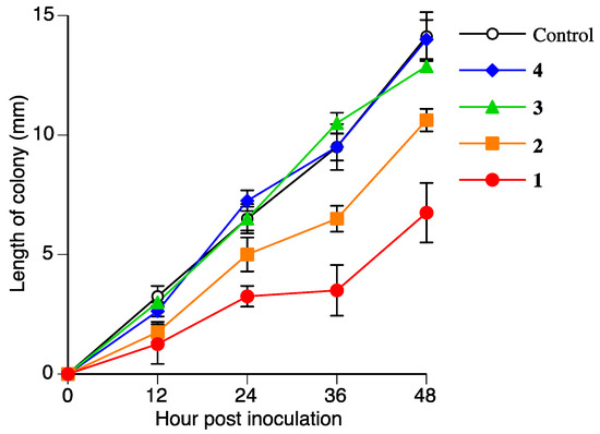 Antifungal activities of 1, 2, 3, and 4 (300 µmol/L) against Rhizoctonia solani mycelium growth. Values are presented as the mean ± SD (n = 4).
