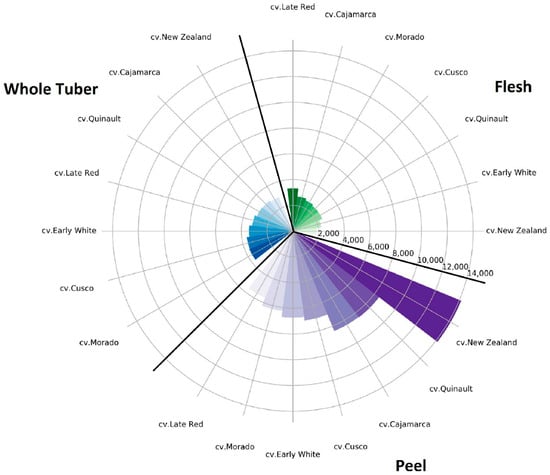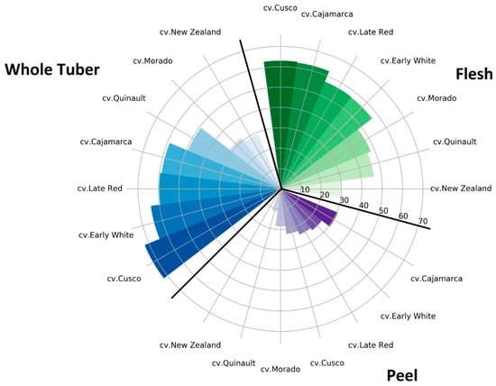 The ranking of the studied cultivars in decreasing order according to the total dry matter content of their flesh and whole tuber is as follows: cv. Morado > cv. Late Red > cv. New Zealand > cv. Early White > cv. Quinault > cv. Cusco > cv. Cajamarca. The total sugar content varied between cultivars. The lowest sugar content was noted for cv. New Zealand in the flesh, peel, and whole tuber. With regard to TPC, TFC, DPPH radical scavenging activity and FRAP of flesh and whole tubers, cv. Late Red, cv. Cajamarca, and cv. Morado were the three top cultivars while cv. New Zealand contained the lowest TPC and TFC when grown under European environmental conditions. However, the highest ABTS radical scavenging activity of the flesh and whole tubers was determined in cv. New Zealand and was the lowest for cv. Late Red which points to the importance of further investigations to determine the individual bioactive compounds.