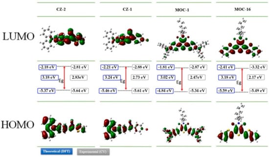 In Figure 1 the theoretical and experimental energies values of the HOMO and LUMO levels as well as the band-gap energy (Egcal) determined by DFT and (Egelec) measured by electrochemical methods (see next section) are shown. CZ-2, CZ-1, MOC-1 and MOC-16 have Egcal values of 3.18, 3.24, 3.02 and 3.18 eV, respectively. These trends of the theoretically calculated energy levels are consistent with the experimental ones, although the values are somewhat different, probably reflecting that the calculations are performed under the gas-phase conditions.