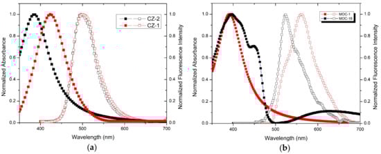 The absorption and fluorescence spectra in solid state films of CZ-2 and CZ-1 are shown in Figure 3a, with a maximum absorption wavelength at 391 nm for CZ-2 and 430 nm for CZ-1, likewise the spectra of fluorescence show their maximum peaks at 498 nm and 499 nm for CZ-2 and CZ-1, respectively. In both cases, contributions of the transitions are observed by the conjugation of the molecules in their absorption spectra. This is because the nπ* transitions are energetically favored over the transitions ππ* or σπ*, since less energy is required for their excitation; further, the symmetry of carbazole molecules allows a suitable orbitals orientation for this interaction [47,48]. Absorption and fluorescence spectra of MOC-1 and MOC-16, in solid state films are shown in Figure 3b where MOC-1 has its maximum peak of absorption at 391 nm while MOC-16 at 397 nm, likewise the spectra of fluorescence show their maximum peaks at 523 nm and 561 nm for MOC-1 and MOC-16, respectively.