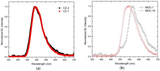 Electroluminescence spectra of OLEDs based on CZ-2, CZ-1, MOC-1 and MOC-16 as emissive layers are shown in Figure 4. The OLEDs based on carbazole derivatives have a maximum peak of electroluminescence in 488 nm for CZ-2 and 492 nm for CZ-1 (greenish blue color for both) with Commision Internationale de L’Eclairage (CIE) coordinates (0.17, 0.30) and (0.16, 0.29), with a difference of only 4 nm between their maxima and with a very similar bandwidth, from which the emission color is so similar. Meanwhile, OLEDs with the emissive layer based on TPD derivatives have their maximum peaks at 564 nm and 547 nm for MOC-1 and MOC-16 (with CIE coordinates (0.41, 0.42) and (0.36, 0.60), respectively).