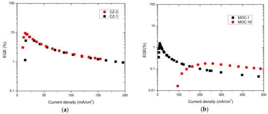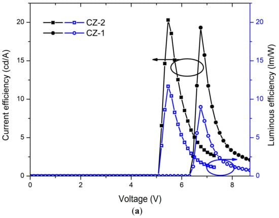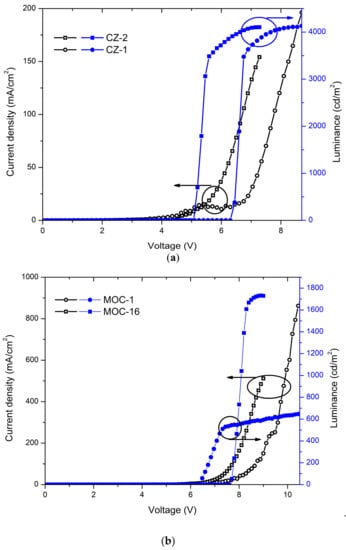 Also, in Figure 5b the J-V curves and luminances are displayed for OLEDs devices based on MOC-1 and MOC-16, while current and luminous efficiencies are shown in Figure 6b. From the J-V curves of OLEDs based on CZ-2 and CZ-1 is observed that the current density increases in the voltage range 4–9 V, whereas for MOC-1 and MOC-16 it takes place in the range 6.5–10.5 V. Likewise, the maximum current density reached by OLEDs based on carbazole derivatives does not overcome 200 mA/cm2, whereas for those based on TPD derivatives the maximum current density is 800 mA/cm2.