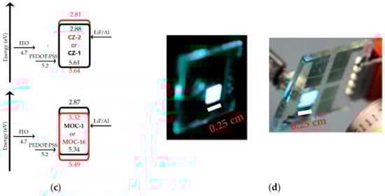 OLED devices (see Scheme 1c) were fabricated on glass substrates covered with indium-tin oxide ITO, which were cleaned with soap, ethanol and acetone in a sonicator. Subsequently, plasma-oxygen treatment was given for 8 min. Poly(2,3-dihydrothieno-1,4-dioxin)-poly(styrenesulfonate) (PEDOT:PSS, CLEVIOS P VP Al 4083) was deposited by spin-coating on the substrate, with a thickness of 30–40 nm, a thermal annealing at was provided for to remove the residual solvent. Within a controlled nitrogen atmosphere, emissive layers (EML) were deposited by spin-coating at different speed to reach the best performance for each EML. By the spin-coating technique, film thickness reproducibility could be around ±8 nm, it is because it is necessary to take care of different experimental details such as speed (RPM), different solvents, concentration (viscosity), initial solution deposition, solution amount, ramp time, plateau time, temperature control, different substrates and their cleaning, and previous treatment, etc. CZ-2, MOC-1 and MOC-16 were dissolved in chlorobenzene at a concentration of 36 mg/mL, while CZ-1, at the same concentration, in a mixture of chlorobenzene and chloroform (20 wt %) in order to change the polarity of the used solution, it was because CZ-1 is not easily dissolved in pure chlorobenzene in comparison to CZ-2. It was used around 10–15 µL of solution for the EML deposition for each substrate. The speed for CZ-1 and CZ-2 thin film formation had a variation from 1000 to 2500 rpm, depending on the desired thickness; for instance, it was used 2000 rpm to reach 70–80 nm for CZ-1 and 1500 rpm to obtain 70–80 nm of thickness for CZ-2. The emissive layers received thermal annealing at for 20 min. Evaporation of 1 nm thickness of LiF was at the rate of 0.01–0.03 Å/s and 150 nm of Al were evaporated at a rate of 0.05 Å/s for the first 30 nm, 0.08 Å/s for the next 70 nm and at 1–1.5 Å/s for the last 50 nm. Morphological and film thickness (for the organic layers) measurements were performed by atomic force microscopy (AFM) (Nanosurf, easyscan2: Liestal, Switzerland) operating in contact mode (when measuring film thickness through AFM, another (additional to the ±8 nm when deposited by spin cast) error about ±2 nm could be introduced). Initially, OLEDs with different EML thickness were fabricated (usually in series of 3–4 devices each one), see Figure S7 (SI). Based on these experiments, the EML thickness was chosen according to the measured current density and luminance values. For realizing of reproducibility/errors, other series of 3–4 devices for each EML type were again fabricated and tested; in general the OLEDs performance followed a similar trend (see Figure S8 (SI); where it can be seen the average values and errors bars/deviation of the J-V-L plots for CZ1 and CZ-2 EMLs).