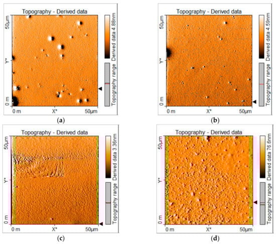 AFM images of deposited layers by spin coating of (a) CZ-2, (b) CZ-1, (c) MOC-1 and (d) MOC-16 molecules. ITO/PEDOT:PSS/EML architecture, as in our OLED devices, was used for these AFM measurements.