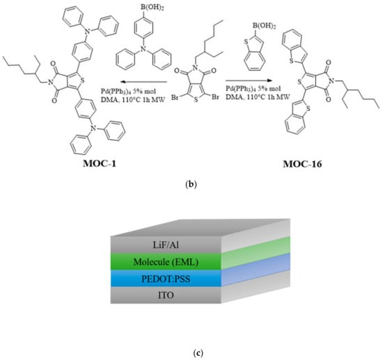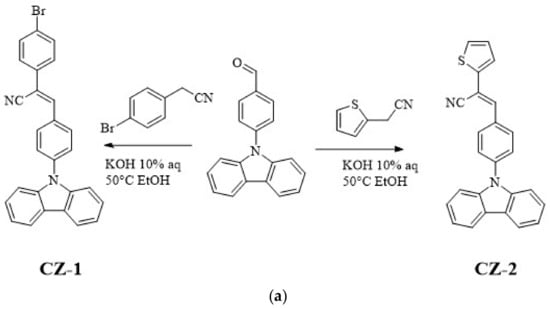 CZ-2, CZ-1, MOC-1 and MOC-16 molecules, were synthesized according to the modified literature procedure (see Scheme 1) [43,44]; CZ-2 and CZ-1 synthesis was carried out by Knoevenagel reaction between N-(4-formylphenyl) carbazole (CZ) and 2-Thiopheneacetonitrile for CZ-2 and 4-Bromophenylacetonitrile for CZ-1. Products were purified by recrystallization; chemical structures were determined by IR, 1H, and 13C NMR, mass spectrometry. On the other hand the synthesis of MOC-1 and MOC-16 was carried out through the Suzuki reaction between 1,3-Dibromo-5-(2-ethylhexyl)-4H-thieno[3,4-c]pyrrole-4,6(5H)-dione (TPD) and Benzo[b]thien-2-ylboronic acid (BT) for MOC-16 and 4-(N,N-Diphenylamino)-1-phenylboronic acid (TPA) for MOC-1. For the reaction, Pd(PPh3)4 was used as catalyst in a microwave heating at 110 °C for 1 h with yields of 70%.