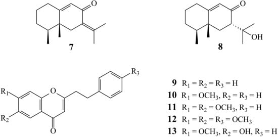 The known isolates were readily identified by a comparison of physical and spectroscopic data (UV, IR, 1H-NMR, [α]D, and MS) with corresponding authentic samples or literature values, and this included four sesquiterpenes, neopetasane (5) [13], 7α-H-9(10)-ene-11,12-epoxy-8-oxoeremphilane (6) [13], dehydrokaranone (7) [5], and ligudicin C (8) [14], and five 2-(2-phenylethyl)-4H-chromen-4-one derivatives, 2-(2-phenylethyl)chromone (9) [15], 7-methoxy-2-(2-phenylethyl)chromone (10) [16], 6,7-dimethoxy-2-(2-phenylethyl)chromone (11) [2], 6,7-dimethoxy-2-[2-(4′-methoxyphenyl)ethyl]chro-mone (12) [17], and 6-hydroxy-7-methoxy-2-(2-phenylethyl)chromone (13) [18].