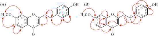 Compound 2 was isolated as a yellowish amorphous powder. The ESI-MS afford the quasi-molecular ion [M + H]+ at m/z 297, implying a molecular formula of C18H17O4, which was confirmed by the HR-ESI-MS (m/z 297.11227 [M + H]+, calcd. 297.11214). The IR spectrum showed the presence of OH (3210 cm−1) and γ-pyrone (1635 and 1600 cm−1) groups. The 1H- and 13C-NMR data of 2 were similar to those of 7-methoxy-2-[2-(4′-hydroxyphenyl)ethyl]chromone (1), except that the 7-OH and 4′-OMe [δH 3.79 (3H, s)] groups of 2 replaced the 7-OMe and 4′-OH groups of 1. This was supported by NOESY correlations between OMe-4′ (δH 3.79)/H-3′ (δH 6.83) and OMe-4′ (δH 3.79)/H-5′ (δH 6.83) and by HMBC correlations between OMe-4′ (δH 3.79)/C-4′ (δC 158.3), H-5 (δH 8.02)/C-7 (δC 156.1), and H-6 (δH 7.09)/C-7 (δC 156.1). According to the above data, the structure of 2 was elucidated as 7-hydroxy-2-[2-(4′-methoxyphenyl)ethyl]chromone. This was further confirmed by the 1H–1H-COSY, NOESY (Figure 3), DEPT, HSQC, and HMBC (Figure 3) techniques.
