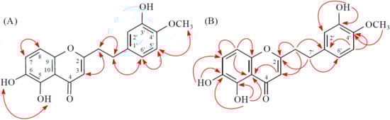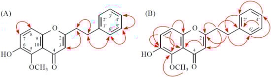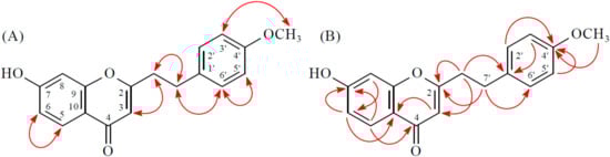 Compound 4 was obtained as a yellowish amorphous powder. The molecular formula C18H16O4 was deduced from a sodium adduct ion at m/z 319.09395 [M + Na]+ (calcd. 319.09408) in the HRESI mass spectrum. The presence of a conjugated carbonyl group was revealed by the band at 1633 cm−1 in the IR spectrum, which was confirmed by the resonances at δC 177.5 in the 13C-NMR spectrum. The IR spectrum also revealed a hydroxy absorption at 3340 cm−1. Comparison of the 1H- and 13C-NMR data of 4 with those of 6-hydroxy-2-(2-phenylethyl)chromone (corylifol A) [12] suggested that their structures are closely related, except that the 5-methoxy group [δH 3.98 (3H, s); δC 62.8] of 4 replaced H-5 of 6-hydroxy-2-(2-phenylethyl)chromone [12]. This was supported by HMBC correlation between OMe-5 (δH 3.98) and C-5 (δC 143.5). The structure elucidation of 4 was supported by 1H–1H COSY and NOESY (Figure 5) experiments, and 13C-NMR assignments were confirmed by DEPT, HSQC, and HMBC (Figure 5) techniques.