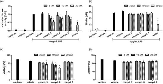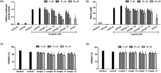 The MTT assay was used according to a previously described method [21]. RAW 264.7 cells or RAW 264.7/Luc-P1 cells (1 × 104 cells) were seeded into 96-well plates and treated with compounds (3, 5–7, and 10–12) and 0.1% DMSO for 24 h.