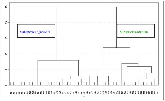 Dendrogram showing the similarities between the leaf oils of the accessions of Melissa offcinalis. (m1–m29: samples of the first cut, M1–M29: samples of the second cut).