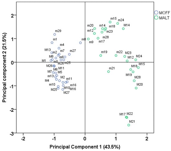 The formation of subclusters in HCA (Figure 1) and the division of the scores in PCA (Figure 2) show for MOFF samples a lower variability than for MALT samples. In addition, in both subspecies, the oil compositions changed noticeably from the first to the second cut. In PCA first cut samples were mostly associated with a positives component 2 score while the second cut samples had rather a respective negative score (Figure 2).