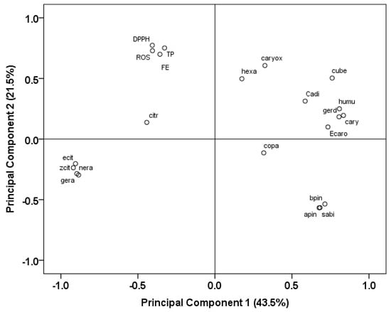 Loading of the leaf essential oil compounds, rosmarinic acid and antioxidant parameters on the components in PCA. The analysis included as variables: apin: α-pinene, bpin: β-pinene, cadi1: α-cadinol, cary: β-caryophyllene, caryox: caryophyllene oxide, citr: citronellal, copa: α-copaene, cube: β-cubebene, DPPH: DPPH antioxidant activity, Ecaro: 9-epi-E-Caryophyllene, ecit: E-isocitral, FE: FRAP, gera: geranial, gerd: germacrene D, hexa: hexadecanoic acid, humu: α-humulene, nera: neral, ROS: rosmarinic acid, sabi: sabinene, TP: total phenolics, zcit: Z-isocitral.