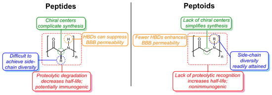 In recent years, peptoids (N-substituted glycine oligomers; [16]) have emerged as a promising class of peptidomimetics [17] with a range of properties, including anti-cancer [18] and antibacterial activities [19,20]. Peptoids have several advantages over peptides as drug candidates, including their ease of synthesis via either solid-phase synthesis (SPS; [16,21,22]) or solution-phase methods [23] and their nonimmunogenic nature [24]. Since peptoids are synthesized from primary amine building blocks, of which thousands are commercially available, tremendous side-chain diversity can be readily achieved [25], and their secondary structures are tunable [20]. Furthermore, compared to peptide-based drugs and other biologics, linear and/or cyclic peptoids have more favorable pharmacokinetic (PK) properties, such as longer biological half-lives, due to their unnatural structures, and higher membrane permeabilities, due to a limited number of hydrogen-bond donors (HBDs; Figure 1) [26,27,28,29]. Together, these properties make peptoids viable drug candidates for any disease, but especially for AD and other CNS diseases in which BBB permeability is critical to drug success.