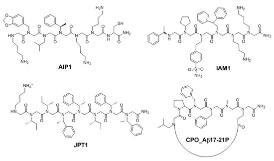 Structures of antiamyloidogenic peptoids AIP1 [40], IAM1 [41,42], JPT1 [43,44,47], and CPO_Aβ17-21P [50]. Protonation states are the same as those shown in the original references.
