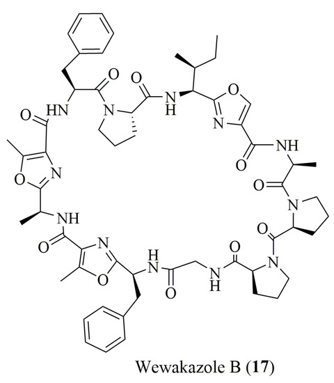 Structure of wewakazole B (17) isolated from a marine cyanobacteria.
