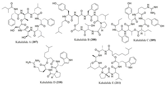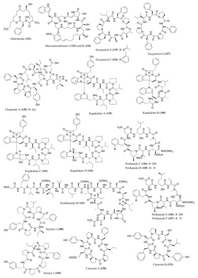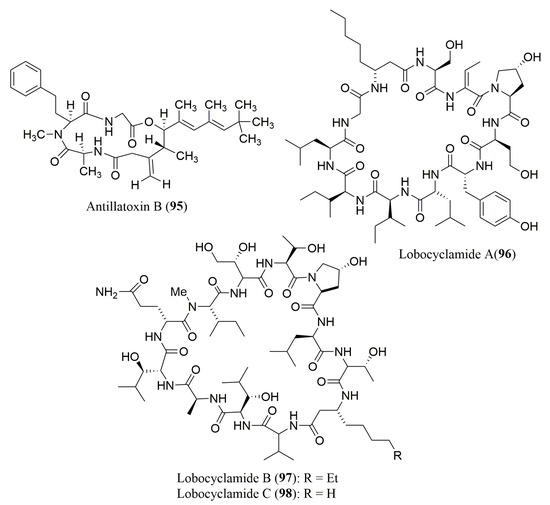Cyanobacteria (blue-green algae), the most ancient known microorganisms on Earth, are a rich source of novel secondary metabolites possessing a broad spectrum of biological activities including antitumor, antibacterial, anticoagulant, antifungal, antiviral, antimalarial, antiprotozoal, and anti-inflammatory activities [58]. Currently, cyanobacteria are one of the most interesting sources of novel marine compounds [59]. Actually, the number of biologically active cyclic peptides, depsipeptides, lipopeptides, and other acyclic or small peptides, many of which containing unusual amino acid residues or modified amino acid units, is impressive. In addition to cyanobacteria, this type of compounds has also been isolated from other marine-derived bacteria.