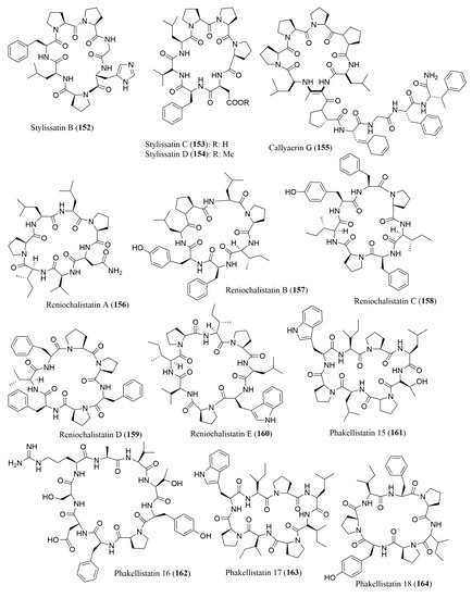 Structure of cyclic peptides 152–164, isolated from marine sponges.