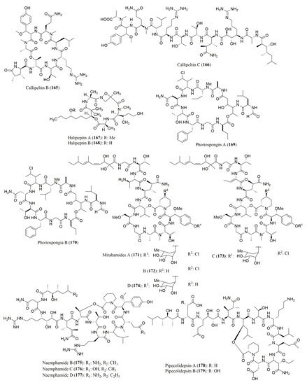 Almost all the cyclic peptides isolated from marine sponges displayed a variety of biological activities. Thus, callipeltin C (166) [143], cyclolithistide A (181) [150], and mirabamides A–D (171–174) [146] exhibited growth inhibitory activity against Candida albicans. Moreover, mirabamides A–D (171–174) also exhibited potent anti-HIV activities towards several HIV strains [146] whereas neamphamides B–D (175–177) displayed cytotoxic activity against several human cancer cell lines, including A549, HeLa, LNCaP, PC3, HEK, and NFF, with IC50 values ranging from 88 to 370 nM [147].