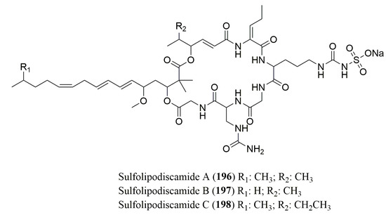 The absolute configuration of the amino acids of new N-sulfoureidylated lipopeptides sulfolipodiscamides A–C (196–198), isolated from the n-butanol fraction of the marine sponge Discodermia kiiensis (Figure 14), was determined by Marfey’s method to be l-Uda and l-Gly (Table 8). Compound 196 was found to be cytotoxic against the murine leukemia cell line P388 with a IC50 value of 15 µM [155].