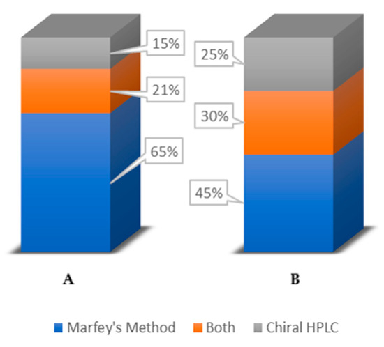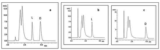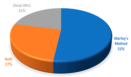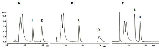 The chiral analysis by HPLC is based on a formation of transient diastereomeric complexes between the amino acids present in the hydrolysates and the chiral stationary phase (CSP) employed, being the less stable complex the first to elute [32]. There are several types of CSPs, such as polysaccharide-based, Pirkle-type, protein-based, macrocyclic antibiotic-based, crown ether-based, ligand exchange type, among others [33,34,35]; however, the last three types are the most used for the separation of primary amine-containing compounds and amino acids [36,37]. Chiral HPLC offers several advantages, when comparing to Marfey’s method, including the direct analysis of the amino acid hydrolysates without further derivatization; moreover, the analysis often provides quicker results. However, poor chemical sensitivity, low sample capacity, and low availability and expensiveness of commercial chiral columns are some of the disadvantages of chiral HPLC method [38].