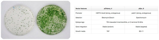 There are already numerous tools for the efficient transformation microalgae. For example, in the case of the microalga Chlamydomonas reindhartii, it is possible to transform the three genomes: nuclear, chloroplastic and mitochondrial. Once transformed, microalgae can be grown in photobioreactors, in controlled conditions and free of pathogens. On the other hand, controlled conditions would avoid release of the transformed microorganism into the environment, and would improve the biosecurity of the final product [92].