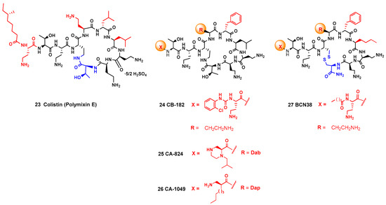 Structures of colistin A, its analog CB-182,804, the Cantab analogs CA-824 and CA-1049, and the Barcelona disulfide analogs. The positions were changes were made are displayed in colors.