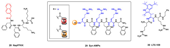The introduction of unnatural hydrophobic and cationic residues into the peptides can improve the antimicrobial activity and the in vivo stability [132]. After systemic truncation and optimization of peptides derived from lactoferricin, novel synthetic antimicrobial peptidomimetics (SAMPs) were identified as drug candidates, and one of them (LTX-109 (30), Figure 3, right), is in clinical trials against bacterial topical infections (Lytix Biopharma AS) [133]. In addition, LTX-109 displayed high antifungal activity against candidiasis and onychomycosis, superior to the current reference drugs, and high selectivity [134].