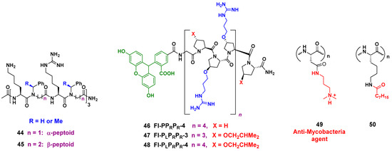 These peptidomimetics are readily synthesized on a solid support through cycles of bromoacetylation and substitution of the halogen group by primary amines. The peptoids disrupt S. aureus membrane through the formation of pores, and display a potent activity against methicillin-resistant S. aureus (MRSA). A good selectivity is achieved, and as an additional advantage, the unnatural backbone is more resistant to proteases [148]. A related strategy is carried out with the α-peptide/peptoid hybrids 44 and 45 (Figure 7, left), where α-aminoacids with cationic chains alternate with N-benzyl glycines. By introducing changes in the lateral chains and the N-substituents, a decreased cytotoxicity and a high activity against multidrug-resistant E. coli are obtained [149]. Other interesting peptidomimetics are lipidated cyclic γ-AApeptides, where the amino groups in the macrocyclic ring are attached to cationic chains. These compounds disrupt bacterial membranes but also induce the immune response and display an anti-inflammatory effect [150].
