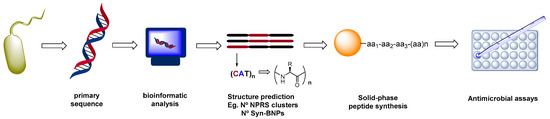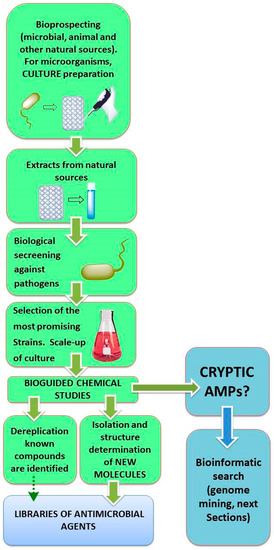 In the traditional approach to discover new bioactive products, they have been isolated from their natural sources by processing a sample, extraction of the metabolites (e.g., by partition with different solvents), and bioguided characterization of the extracts (Scheme 1, [64]). However, this procedure has limitations. For AMPs, the isolation techniques depend on the amount of peptide available [64,65,66,67,68].