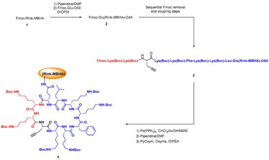 The standard solution and solid phase synthesis of small and medium-size peptides is well-known [96,97,98,99,100], but the preparation of difficult sequences can pose many problems, and has been reviewed by Albericio et al. [101]. In the case of cyclic peptides, the cyclization may be troublesome, and different approaches have been developed, from dilution conditions to the development of new coupling reagents, use of enzymes, use of native peptide ligation methodologies, etc. [102,103,104,105]. Scheme 4 shows the solid-phase synthesis and cyclization of an antimicrobial BPC precursor (conversion 1→4 [106]).