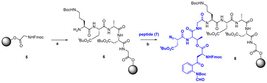 For the generation of large peptides, several small or medium-size fragments are synthesized and then attached. Usual ligation methods are solution or solid-phase fragment condensation (Scheme 5), and native chemical ligation (Scheme 6). In Scheme 5, the pentapeptide 6 is produced by solid-phase synthesis, and then coupled to fragment 7 to give a precursor 8 of a polymyxin analogue [110]. In the final analogue, the Dab-3 residue was replaced by a Dap-3 unit, and a synthetic, more polar side-chain was introduced. The analogue was active in vitro against Gram-(−) bacteria, such as Acinetobacter baumanii and Pseudomonas aeruginosa [8,41,110].