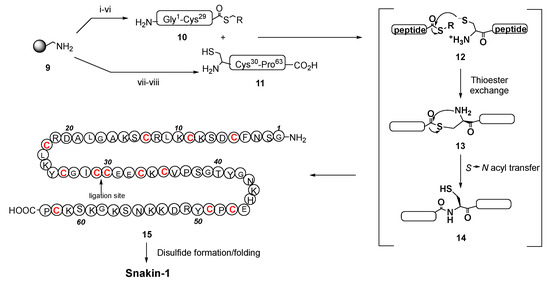 For the synthesis of snakin-1, an antimicrobial peptide produced by several plants, such as potato, rice, maize, soybean, and strawberry, a native chemical ligation method was used. As shown in Scheme 6, two fragments 10 and 11 were produced by solid-phase synthesis, and then ligated (conversion 12→14) to give the snakin precursor 15. Oxidation of the cysteine units generated six internal disulfide bonds, providing the folded snakin-1 in about 50% yield [107]. The native chemical ligation has also been used to cyclize peptides, as in the case of θ-defensins [108].